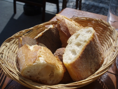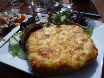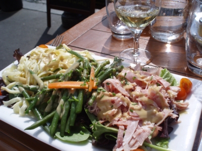 My dining companion and I knabbed a table right in front about 2pm. I decided to go the very café cuisine route by ordering a croque monsieur (a grilled ham sandwich with béchamel sauce and melted gruyere cheese) and salade verte and my companion ordered a salade composée with ham, gruyere cheese, green beans and lettuce with French vinaigrette. All was served with a basket of baguette slices, and we washed it all down with the house white wine from the Loire valley. Délicieux–and oh so simple!