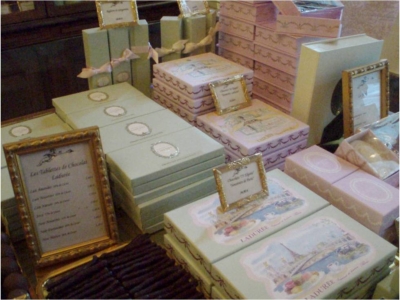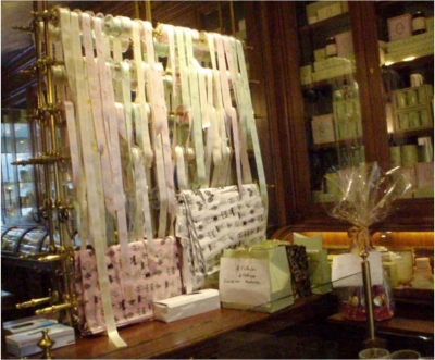 Les pâtisseries et les chocolateries (pastry and chocolate shops) in particular devote considerable artistic talent to their gift wrap offerings. One of my favorites is Ladurée, the celebrated pastry shop. Their ribbons and boxes are a sort of “pastel heaven” of pale pinks and greens. After polishing off a small coffret of their famous macarons (almond macaroons), I use the delightful boxes to sort things on my desk or in drawers, making the packaging pleasure last that much longer.