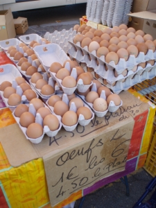 A recent trip to the Saturday market at Arles in Provence gave me a whole new view on fresh. There were the usual suspects-fruits, vegetables, flowers, honeys, olive oil, cheeses, meats, and farm-fresh eggs. You could even buy an entire plateau (tray) of 30 eggs for 4.50 euros. What a bargain! But I suppose you’d have to be cooking for an army or making a whole lot of pâtisseries (pastries) to use up all those eggs.