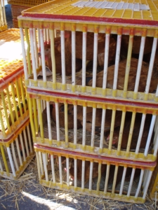 On this particular sunny Saturday, the poultry vendors were doing a brisk business. Customers were lined up two and three deep to purchase their choice of fowl. It was a fascinating process to watch. First, the customer told the vendor what she wanted. Then, the vendor expertly cut slits or air holes in the appropriately sized cardboard box. Next, the vendor opened the bird container, thrust a hand into the mass of living feathers and flesh, chose the best fowl for the customer, and quickly tucked it into the prepared cardboard box. Money was exchanged, and the customer went on her way. I could have parked by this stall and watched the live bird spectacle the entire morning.