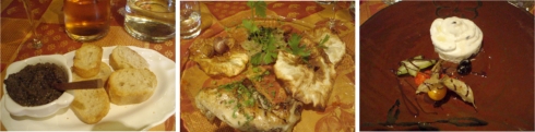 We sat down in the main dining room of Le Vieux Four and ordered. Soon, une carafe de rosé (a carafe of rosé wine) and de la tapenade (black olive spread) with bread arrived. We started to feel better immediately. I then had le plat du jour (the day’s special): la cuisse de lapin à l’huile d’olive avec compote de fenouil aux olives (rabbit cooked in olive oil with fennel compote and olives). C’était délicieux! To finish le repas (the meal), I tried the nougat glacé, a type of nougat ice cream. Le nougat is a specialty of the region given all the almond trees that grow in the area. Yum!
